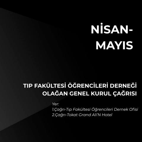 Tıp Fakültesi Öğrencileri Derneği Olağan Genel Kurul Toplantısı 25 Nisan 2026 Saat 22.00'de Ankara Koç İkiz Kuleleri'nde bulunan Tıp Fakültesi Öğrencileri Dernek Ofisi'nde gerçekleştirilecektir. Bu toplantıda çoğunluk sağlanamadığı takdirde, bir sonraki toplantı 2 Mayıs 2026 günü Tokat’ta, Grand Ali’N Hotel'de 22.00'de gerçekleştirilecektir. Dernek Genel Kurul Toplantısı gündem maddeleri aşağıdaki gibidir.